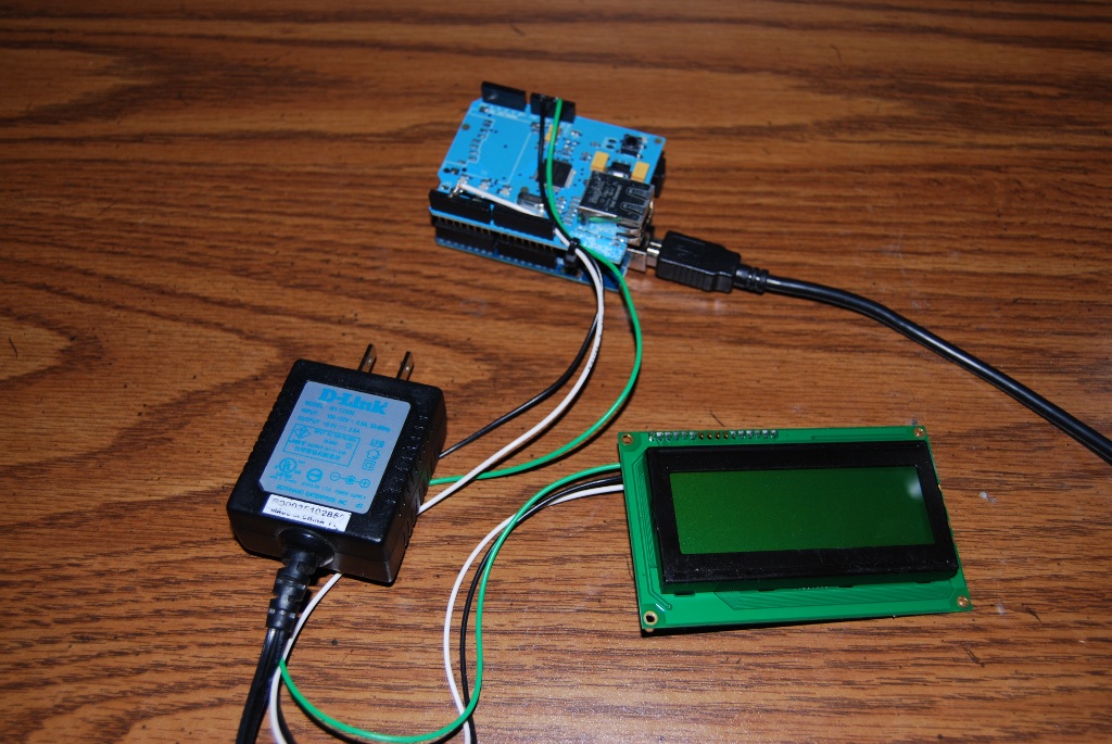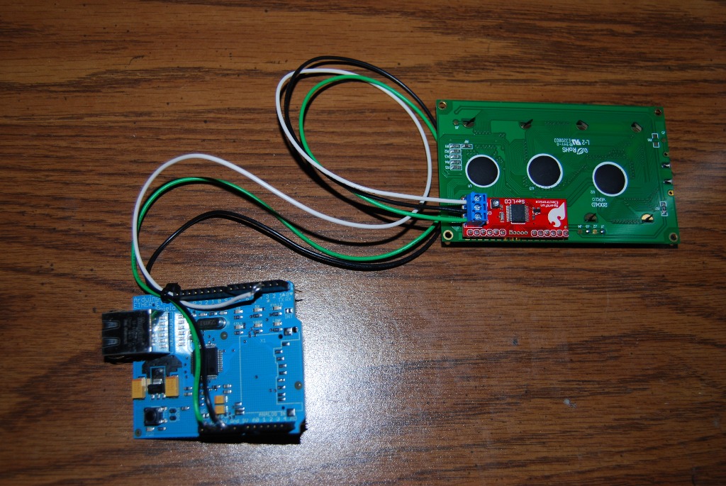 The Arduino USB Board is a great microcontroller to get you started and will allow you to build anything from notification systems to robots. The Ethernet Shield is a simple module that drops on top of the Arduino Board and allows the microcontroller to connect to an Ethernet connection and transfer data. The LCD screen I chose was serial enabled (simplifies our job immensely) so you just need to connect 3 wires to the display. You’re also obviously going to need a power source to power the whole thing (unless you want to tether the Arduino to your PC, but that defeats the purpose of a PC independent Twitter reader…now doesn’t it?) I was able to use a 5v regulated power adapter I had lying around but if you don’t have one of those I’d suggest getting the 9v adapter w/ barrel connector from SparkFun. Anyway, onto the build…