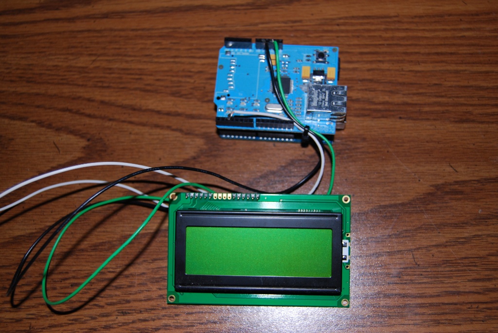 Next I had to find a way to connect these wires into the Arduino without just jamming the stripped wire directly into the Arduino. I found some small pins (you can use old resistors or any component for that matter which has solid pins coming from it) and soldered them to the ends of the wires that I connected to the LCD display. I then plugged these pins into the Ethernet Shield and zip tied the wiring in place. I connected the signal wire to pin 2 and the power wires to 5v and GND.