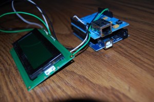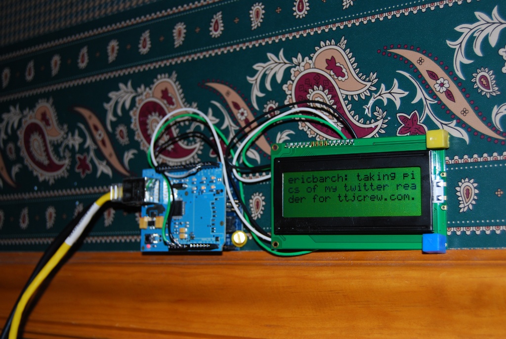 This is the HTTP header that we are sending to twitter.com. Obviously for the first line you will enter your username before the “.xml”. For the second line we need to setup authentication with our twitter username and password. Basic HTTP authentication is simply the string “username:password” base64 encoded. So if your username was “foo” and your password was “bar”, you just need to base64 encode the string “foo:bar”, which would result in the authentication key of “Zm9vOmJhcg==”. For base64 encoding I simply just searched on google for a site that allowed you to enter a string and have it encoded to base64. It’s pretty easy to write a PHP script to do this as well, but I only needed to do it once so I just ended up using this site. Once you’ve got your authentication key entered into the sketch, upload it to your Arduino, connect an Ethernet cable, and you should be set to go. The Arduino will immediately begin pulling down your “friends” timeline and parsing out the most recent tweet. The software will automatically scroll between 2 pages if the tweet becomes that long.