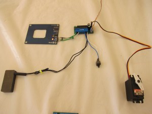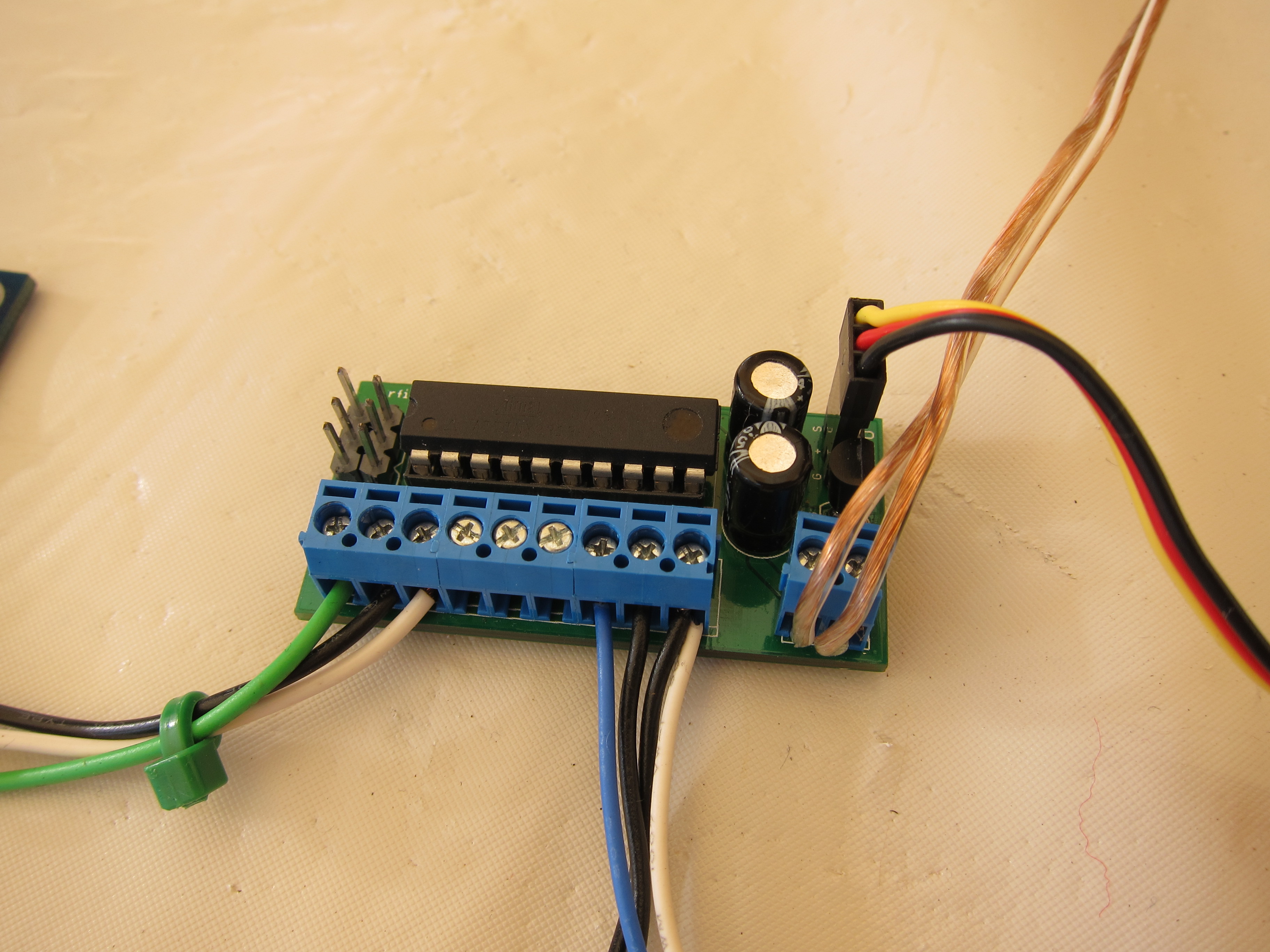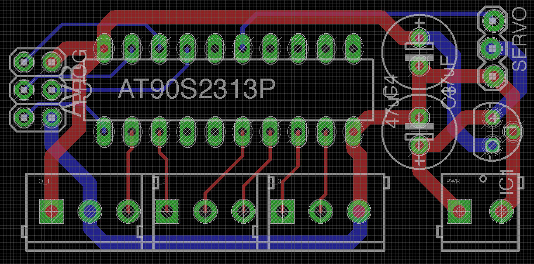 As far as assembly of the board goes, it’s pretty straight forward. Solder in the 20 pin socket (make sure to line up the notch), snap the screw terminals together and solder them in place, solder in the 2 capacitors, the voltage regulator, and then break apart the header strip to populate the programming header and servo header. Pop your ATtiny2313 microcontroller into the socket (making sure to match up the notch) and you’re ready to program.